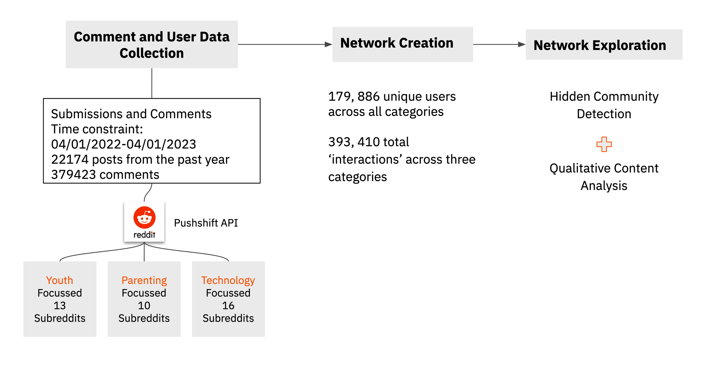 Collected data on 180K+ users and 393K interactions across 40 subreddits using the Pushshift API